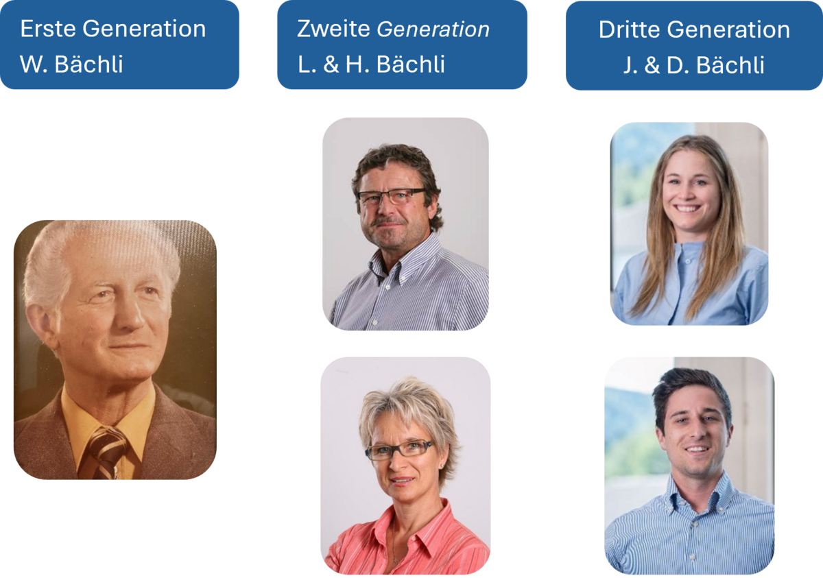 Seit 2020 wird die Bächli AG von Jennifer und Daniel Bächli geführt. Die Geschwister sind Inhaber des Unternehmens, Mitglieder des Verwaltungsrates und Teil der Geschäftsleitung. Daniel Bächli ist seit über zehn Jahren im Familienunternehmen tätig und sammelte Erfahrungen in verschiedenen Bereichen, unter anderem in der Produktion und im Verkauf. Jennifer Bächli war bereits früh in kleineren Pensen im Unternehmen tätig, beispielsweise in der Buchhaltung. Im weiteren Verlauf ihres Berufslebens absolvierte sie einen MBA, der ihr vertiefte Einblicke in zusätzliche Fachbereiche ermöglichte und ihre Rolle im Unternehmen weiterentwickelte.